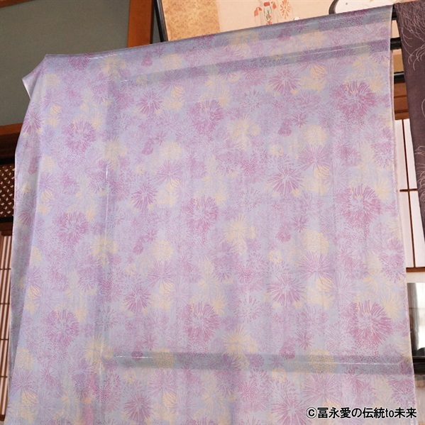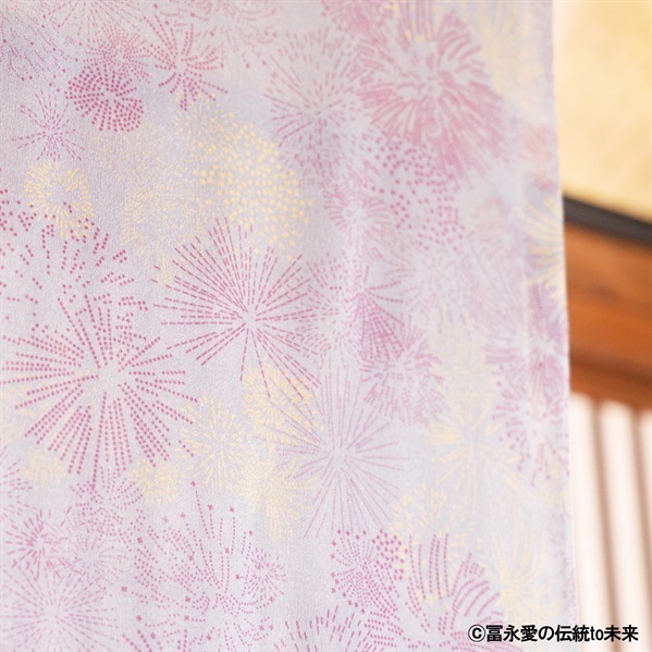 本作は、膨大な伊勢型紙の中から冨永愛自身が「花火」の文様を選び、配色までを監修。